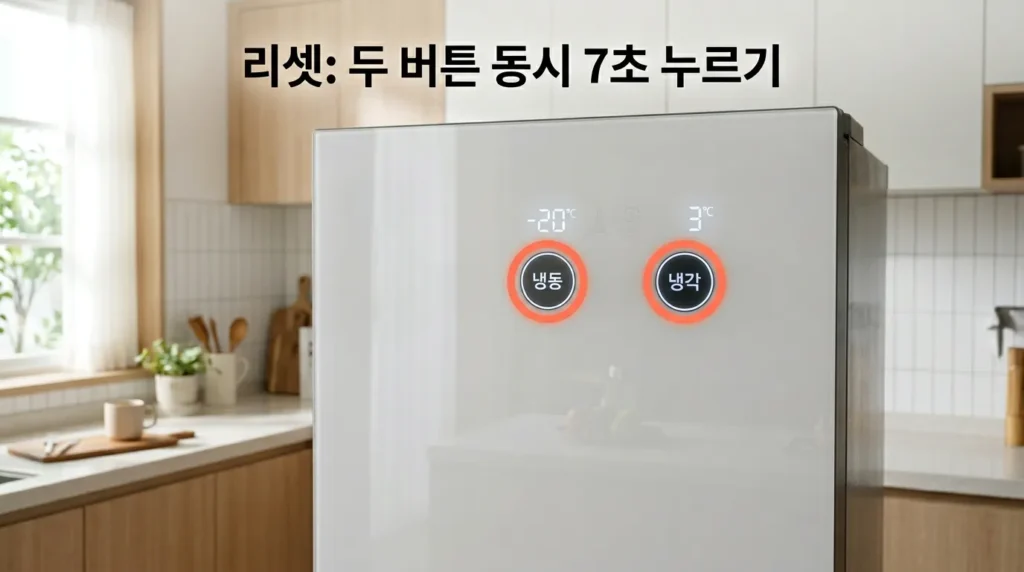 4. 에러 지속 시: 냉장고 패널의 냉동 버튼 + 냉각 버튼을 동시에 7초 눌러 에러 초기화